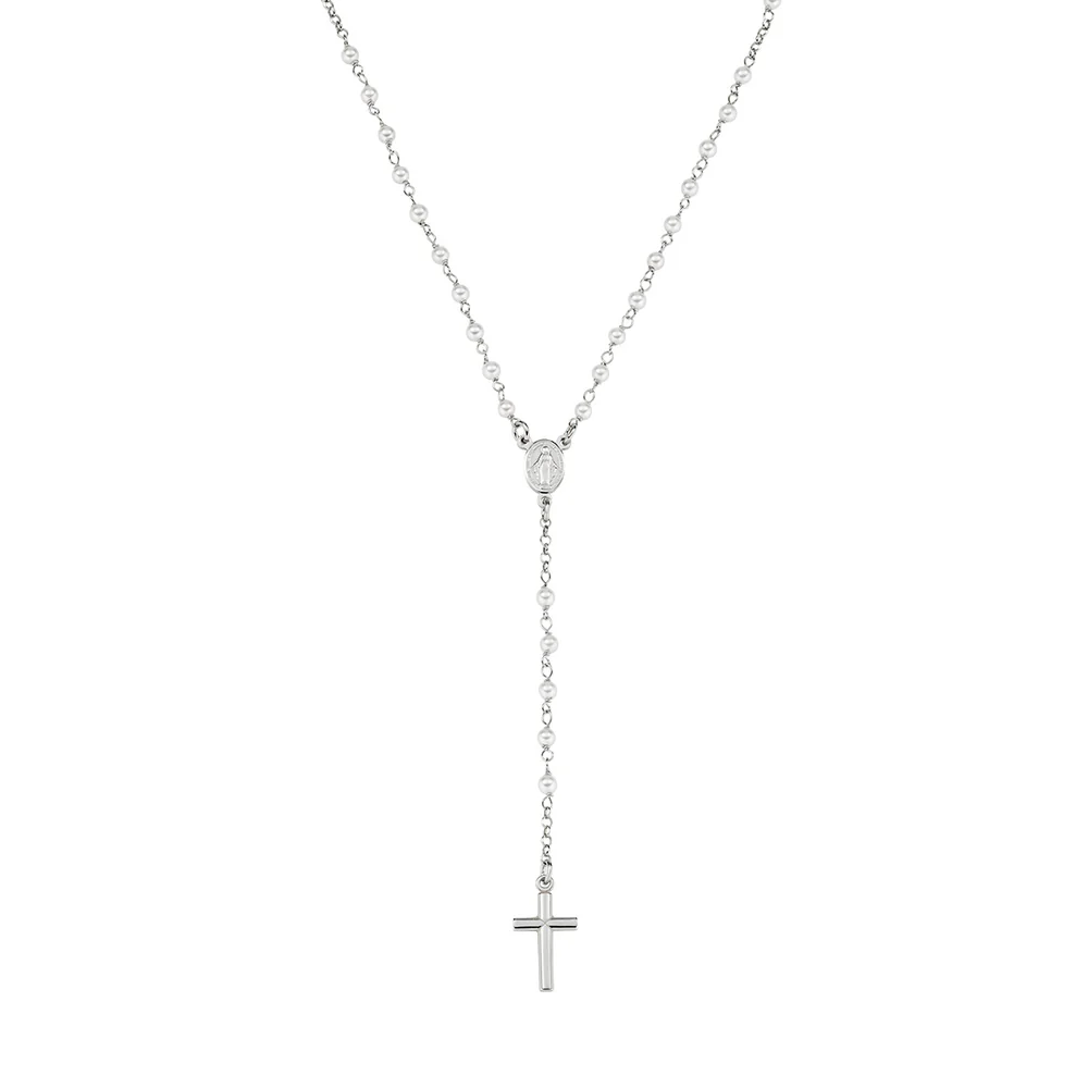 Klasična Y-krunica ogrlica s bijelim kristalnim perlama promjera 3 mm, s križem i medaljicom Čudotvorne Gospe. Duljina ogrlice može se prilagoditi od 48 do 50 cm pomoću karabiner kopče i produžnih karika.