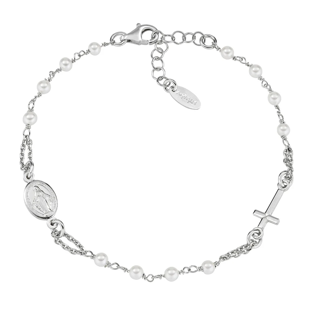Krunica narukvica s bijelim kristalnim perlama promjera 3 mm, s križem i medaljicom Čudotvorne Gospe. Duljina narukvice može se prilagoditi od 18 do 20 cm pomoću karabiner kopče i produžnih karika.