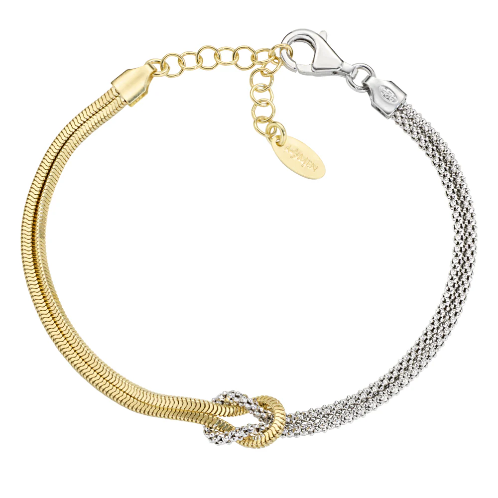 Elegantna narukvica od srebra presvučenog rodijem i žutim zlatom s dva isprepletena lanca koji tvore središnji čvor. Love Knot narukvica simbolizira vječnu ljubav i privrženost te čuva naše najposebnije veze. Dostupna u dvije veličine.