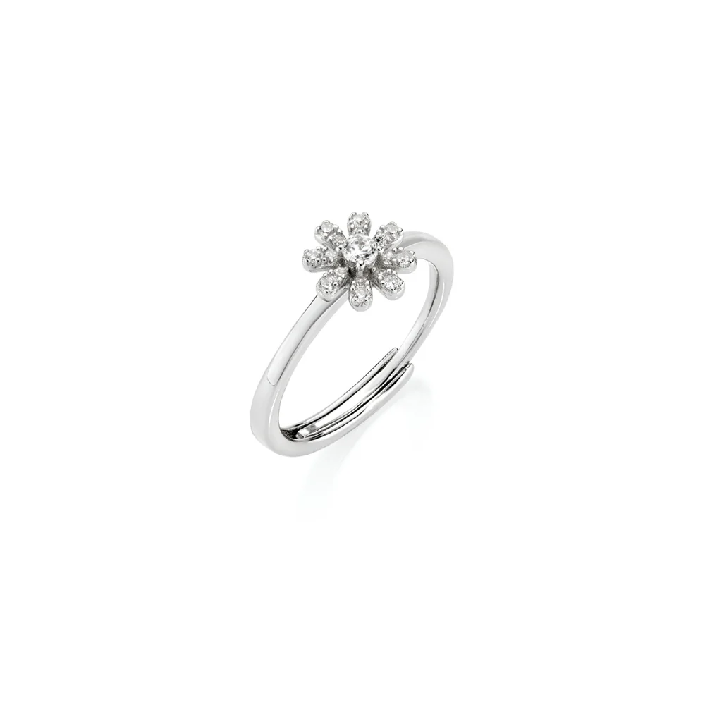 Elegantni podesivi prsten izrađen od srebra 925 . Ukrašen je nježnim cvjetićem tratinčice od bijelih cirkona koji mu daju profinjen i sjajan izgled. Zahvaljujući podesivom dizajnu, prsten je dostupan u dvije veličinske varijante – od 10 do 14 i od 16 do 20 – što omogućuje savršeno pristajanje svakom prstu.