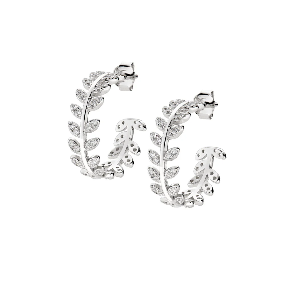Elegantne kružne naušnice izrađene od srebra presvučenog rodijem, koje osigurava dugotrajan sjaj i otpornost na tamnjenje. Dizajn je inspiriran maslinovim grančicama – simbolom mira, mudrosti i vječne ljepote. Listovi su ukrašeni pažljivo umetnutim bijelim cirkonima koji dodaju profinjen sjaj i luksuzan izgled.
