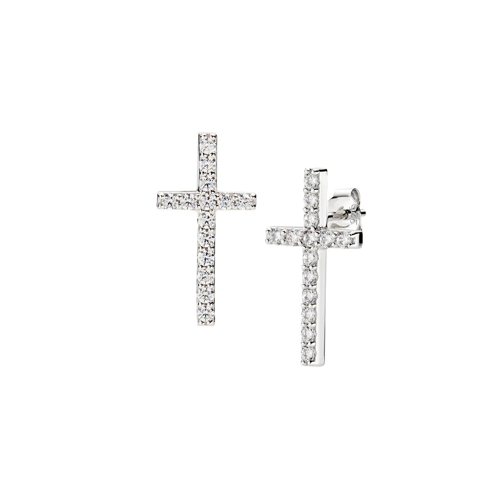 Elegantne naušnice izrađene od sterling srebra s rodij premazom, s dugim privjeskom križa od 2 cm ukrašenim bijelim cirkonima koji pružaju profinjen i sjajan efekt.