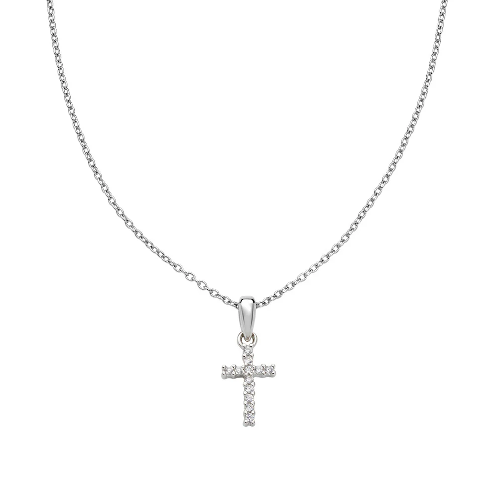 Ogrlica izrađena od sterling srebra s rodij premazom, s elegantnim privjeskom križa dimenzija 1,2 cm ukrašenim bijelim cirkonima koji pružaju suptilan i profinjen sjaj.