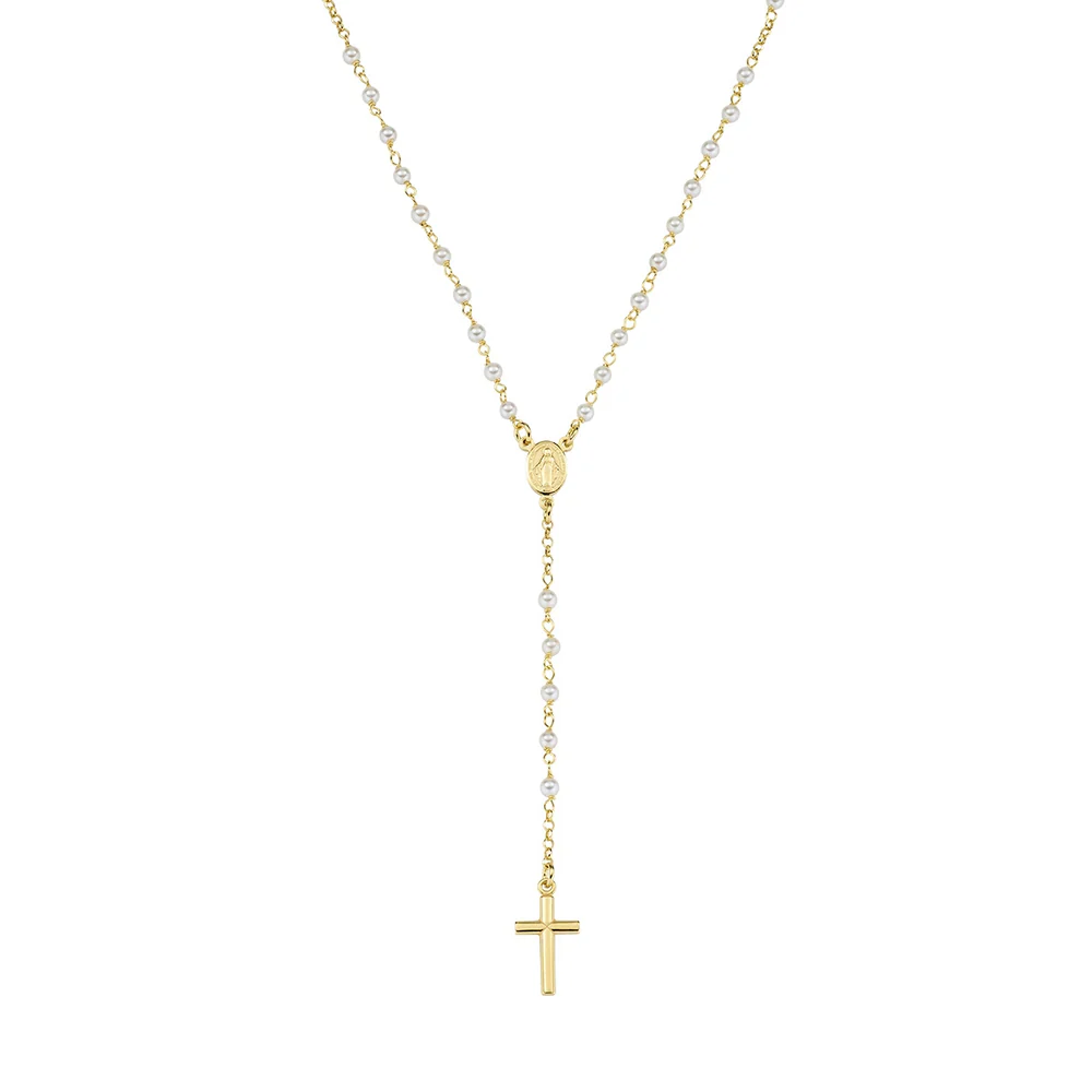 Klasična krunica ogrlica u obliku slova Y, pozlaćena žutim zlatom, s bijelim kristalnim biserima promjera 3 mm, s križem i medaljonom Čudotvorne Gospe. Duljina ogrlice može se prilagoditi od 48 do 50 cm pomoću kopče u obliku jastoga i produžnih karika.