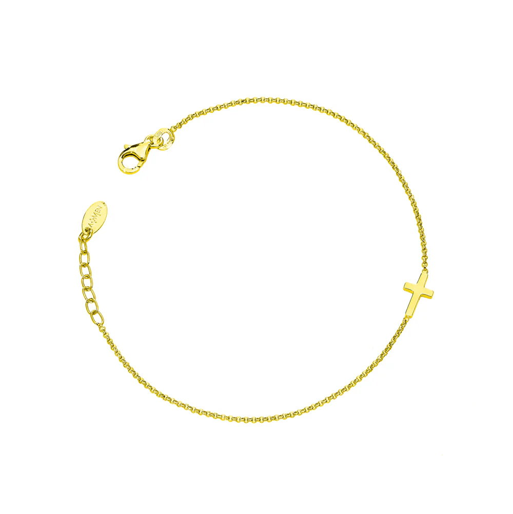 Lančana narukvica od sterling srebra pozlaćena žutim zlatom s križem. Duljina se može prilagoditi od 16 do 19 cm.