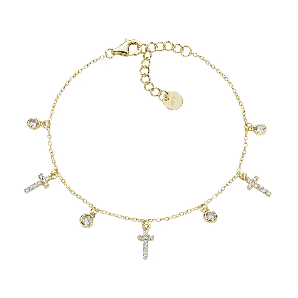 Višenamjenska narukvica izrađena od sterling srebra s pozlatom u žutoj boji, s više visećih privjesaka u obliku križeva i detaljima od cirkona koji daju elegantan i profinjen sjaj.