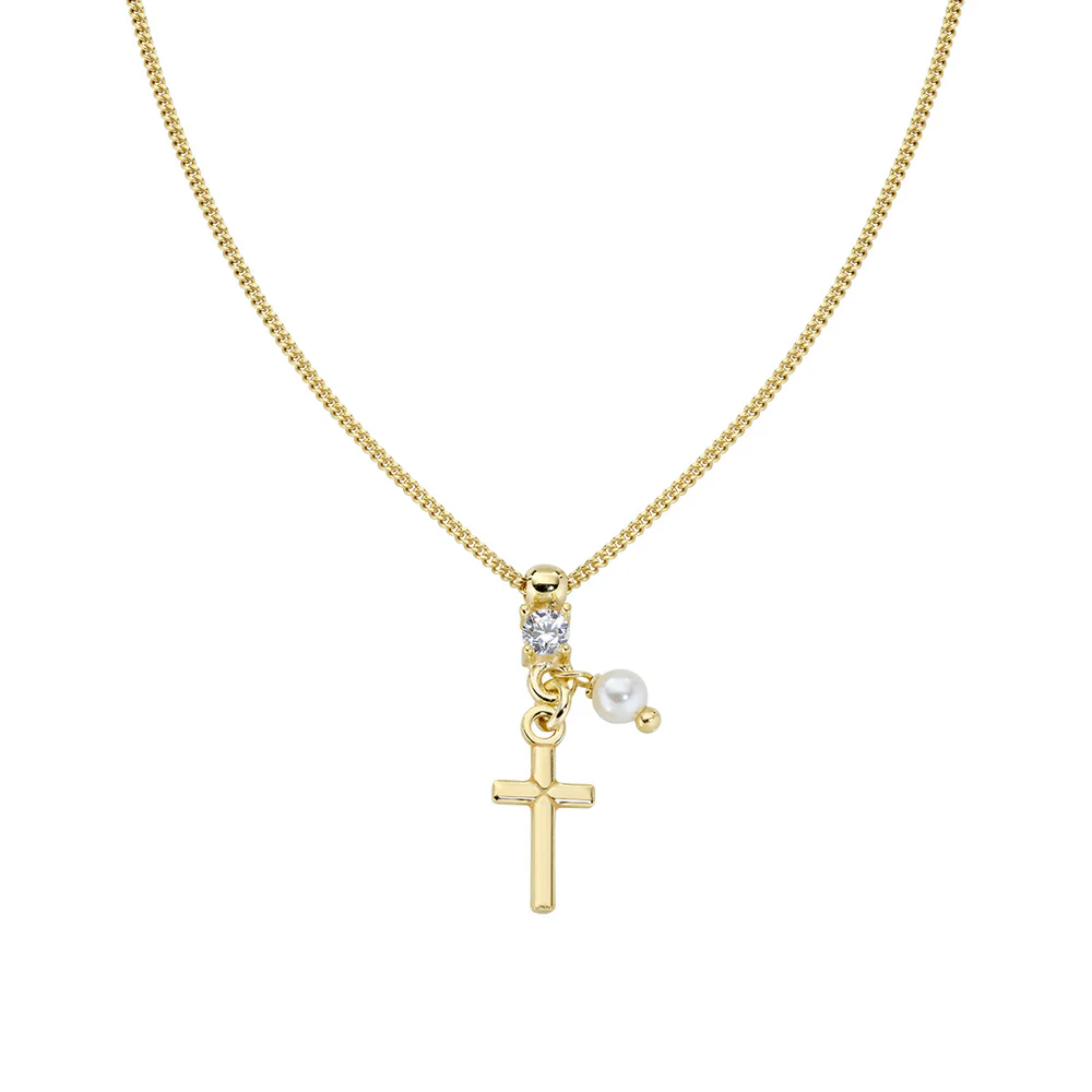 Elegantna lančić od srebra presvučenog žutim zlatom s privjeskom u obliku križa, ukrašenim cirkonom i završnim detaljem od bisera. Cirkon i biser imaju promjer od 3 mm, a ukupna dužina privjeska iznosi 2 cm.