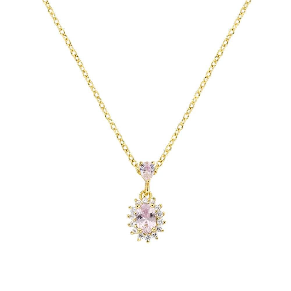 Ogrlica od sterling srebra s pozlatom, s privjeskom u obliku ovalno brušenog morganit kubičnog cirkona u halo okruženju, koji je obješen na kapljičasti cirkon iste boje.