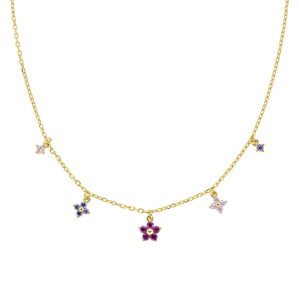 Ogrlica od srebra s rodijskom prevlakom, ukrašena visećim cvjetićima od višebojnog kubičnog cirkona koji nježno hvataju svjetlost pri svakom pokretu.