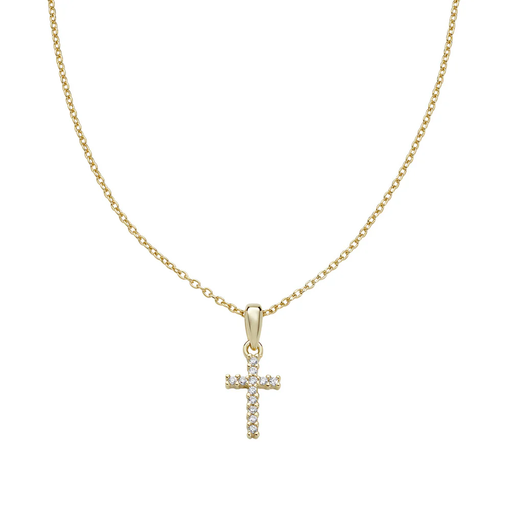 Ogrlica izrađena od sterling srebra s pozlatom u žutoj boji, s elegantnim privjeskom križa dimenzija 1,2 cm ukrašenim bijelim cirkonima koji daju suptilan i profinjen sjaj.