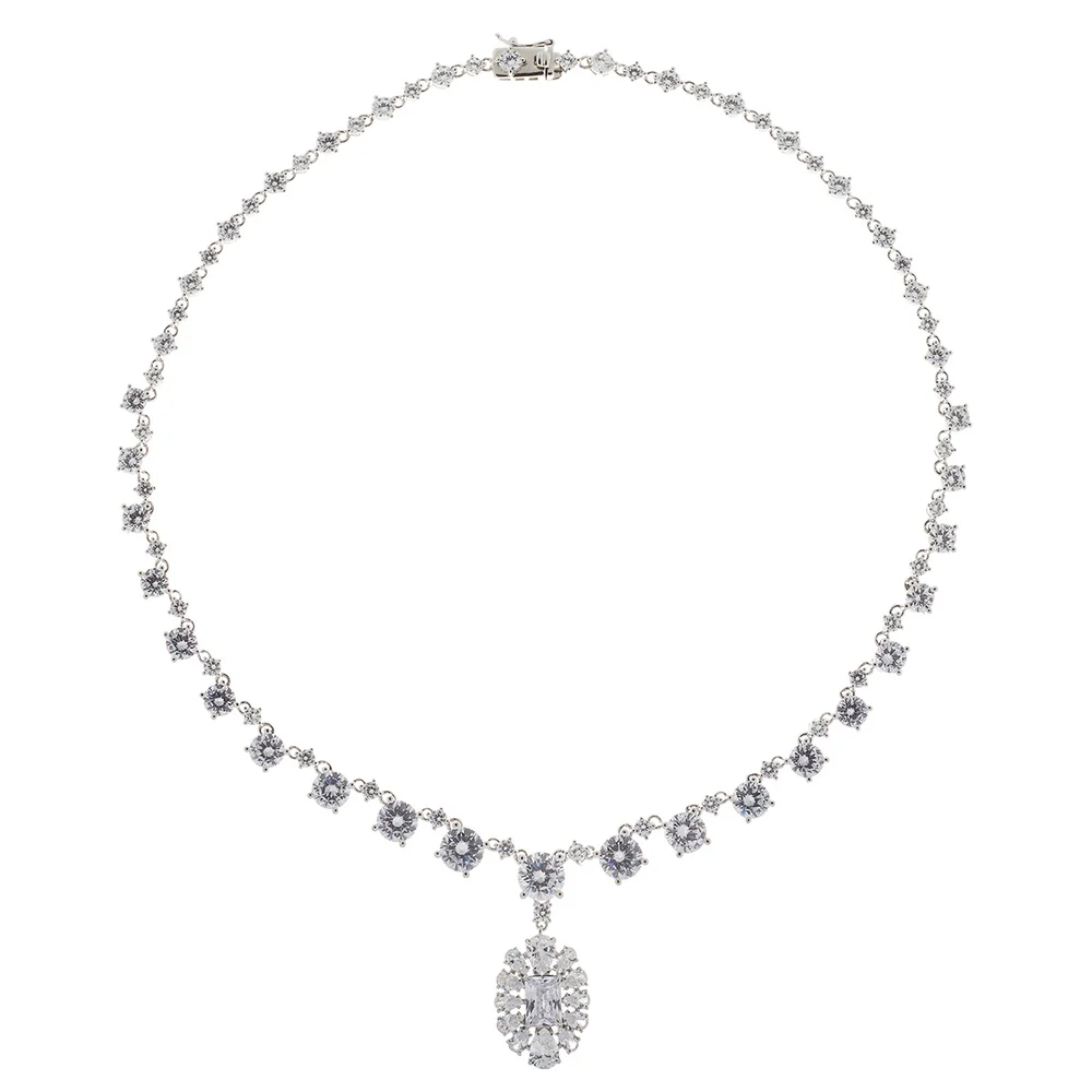 Ogrlica od srebra presvučena rodijem rodijem ukrašena bijelim cirkonima. Fiksna duljina ogrlice: 40 cm. Ukupna duljina privjeska iznosi 2,5 cm.